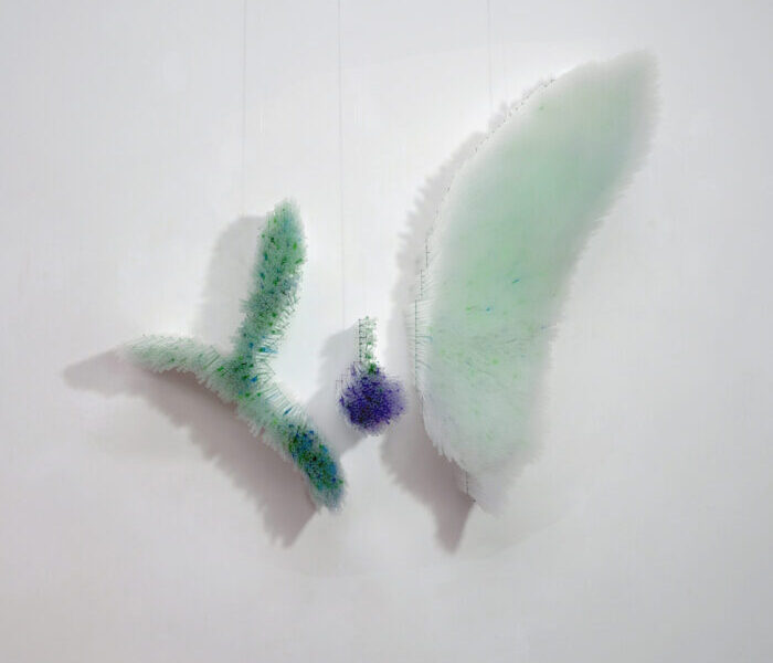 - Hope • 2024 Transparent, green and blue straws, steelmesh, three peces, 98 x 48 x 25 cm